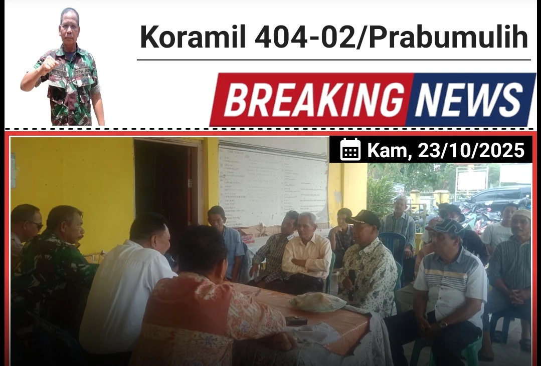 Kodam II/Sriwijaya, Prabumulih – Babinsa Kelurahan Anak Petai, Serma Ahmad, yang merupakan anggota Koramil 404-02/Prabumulih Kodim 0404/Muara Enim, menghadiri rapat bulanan di kantor lurah Anak Petai, Kecamatan Prabumulih Utara, Kota Prabumulih. Kegiatan ini berlangsung pada hari Kamis, 23 Oktober 2025, dimulai pukul 14.00 WIB.