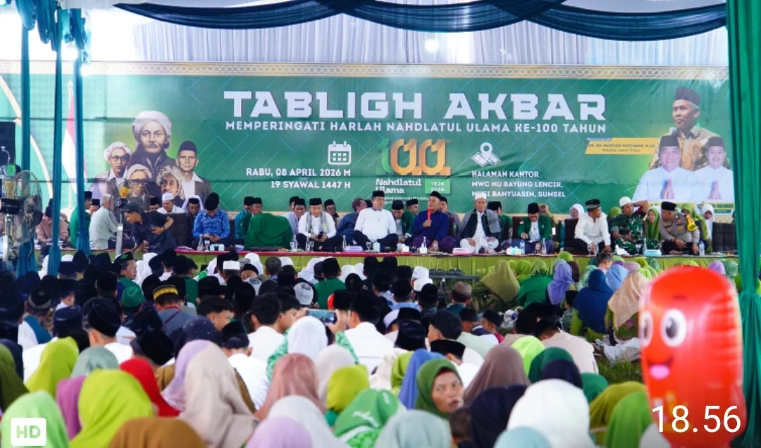 Kompasnewsinvestigasi. Id~Bayung Lencir, Muba – Semangat satu abad Nahdlatul Ulama terpancar kuat di Halaman Kantor Majelis Wakil Cabang Nahdlatul Ulama (MWC NU) Kecamatan Bayung Lencir. Bupati Musi Banyuasin, H.M. Toha Tohet, S.H., menghadiri langsung kegiatan Tabligh Akbar dalam rangka memperingati Hari Lahir NU ke-100, Rabu (08/04/2026).