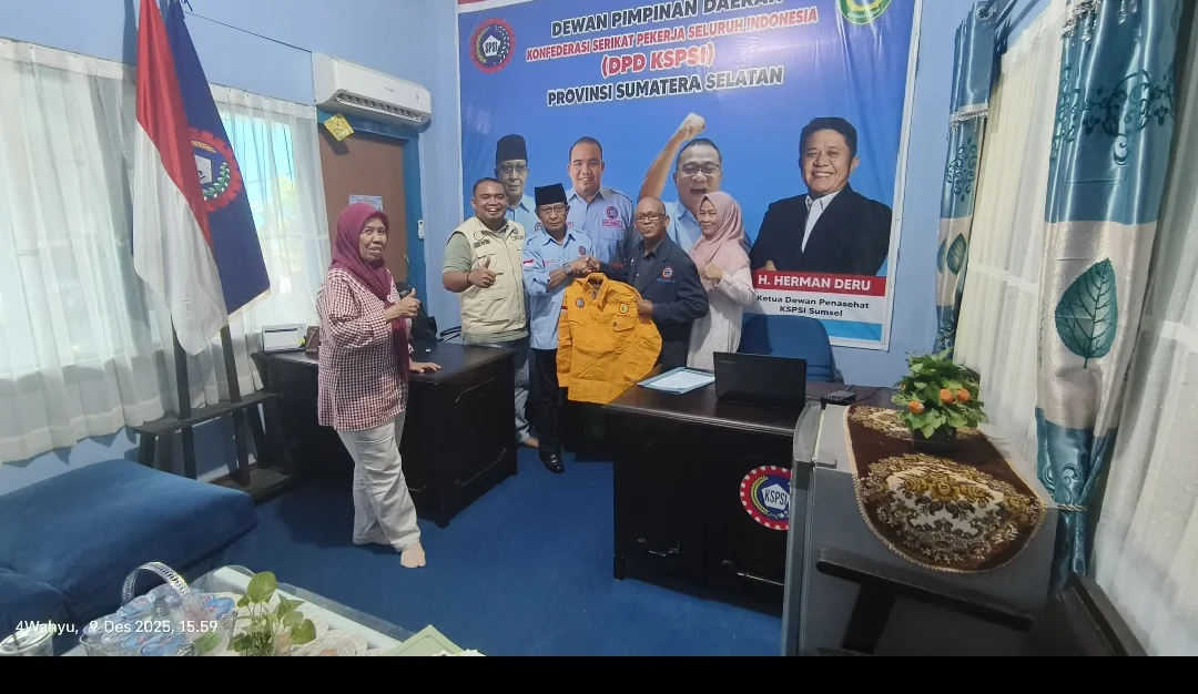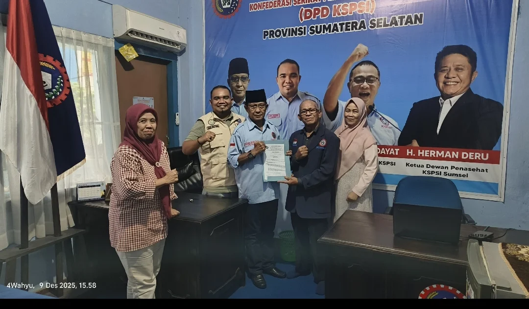 Kompasnewsinvestigasi.Id~palembang~ Ketua DPD KSPSI Sumsel H. Zainal Arifin Hulap. S.IP. didampingi Sekretaris Cecep Wahyudin, SP. Menyerahkan SK kepada Ketua DPC KSPSI Kab. Ogan Ilir Terpilih Bpk. Gusti M.Ali sekaligus Penunjukan Sebagai Ketua PC FSP.NIBA-SPSI Ogan Ilir ditandai dengan p?Penyerahan baju NIBA-KSPSI pada Hari Selasa, 09 Desember 2025 di Kantor DPD KSPSI Sumsel Jln. Veteran Kota Palembang ini merupakan acara penting bagi KSPSI Sumsel untuk memperkuat Organiasasi dan Struktural kebersamaan antar pengurus dan anggota.