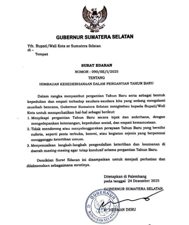 Kompasnewsinvestigasi. Id~Palembang ~ Gubernur Sumatera Selatan (Sumsel) H. Herman Deru menerbitkan Surat Edaran tentang Himbauan Kesederhanaan dalam Pergantian Tahun Baru yang ditujukan kepada seluruh Bupati dan Wali Kota se-Sumatera Selatan.