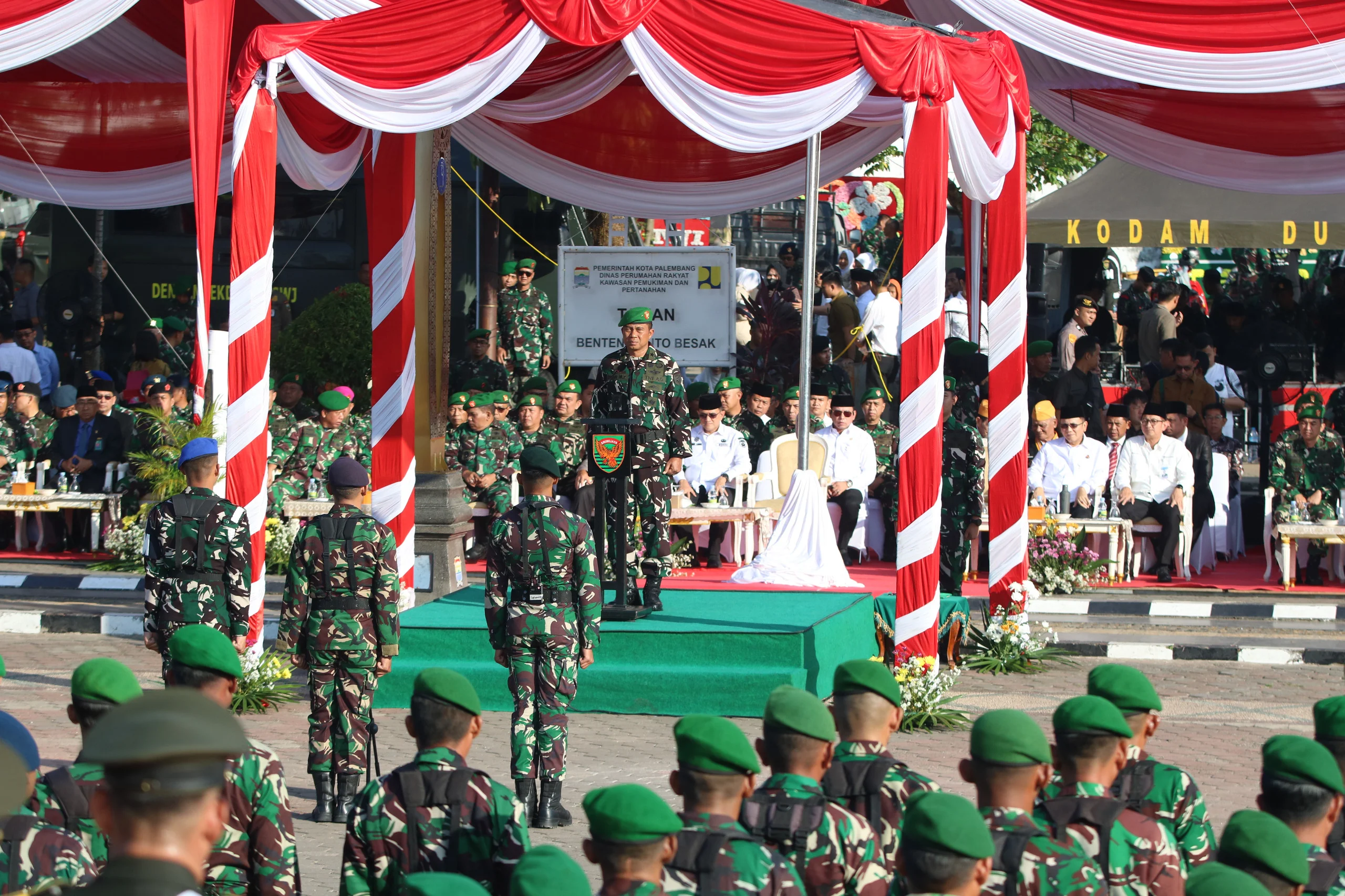 Dalam amanatnya, Kasdam II/Sriwijaya membacakan sambutan Panglima TNI, Jenderal TNI Agus Subiyanto, S.E., M.Si., yang menekankan pentingnya peran TNI dalam menjaga keutuhan dan kedaulatan bangsa. Tahun ini, peringatan HUT TNI mengusung tema “TNI Prima – TNI Rakyat – Indonesia Maju”, yang mencerminkan semangat profesionalisme dan pengabdian TNI kepada rakyat Indonesia.