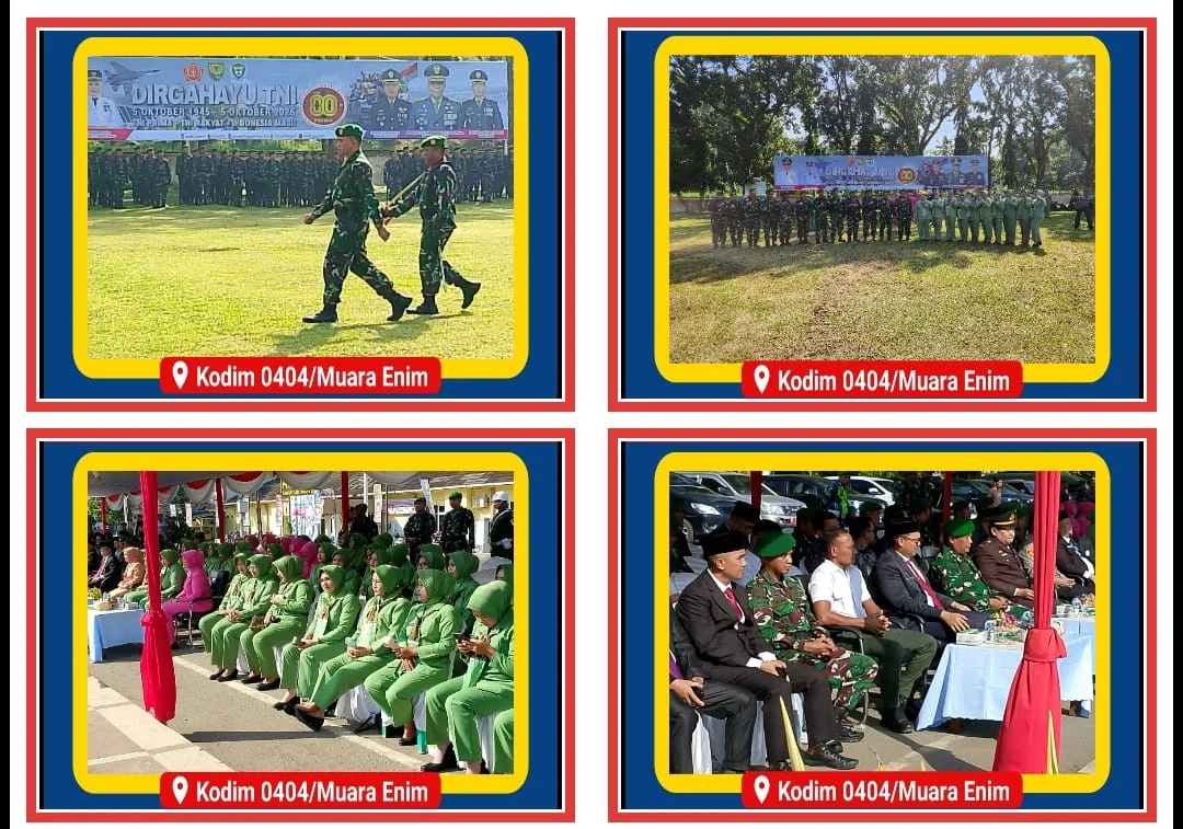Muara Enim, kompasnewsinvestigasi.id – Kodim 0404/Muara Enim turut serta dalam Upacara Peringatan Hari Ulang Tahun (HUT) Ke-80 TNI Tahun 2025 yang berlangsung khidmat di Lapangan Merdeka Muara Enim,Minggu (05/10/2025).Upacara dimulai pukul 08.00 WIB, dihadiri Bupati Muara Enim diwakili oleh Juli Jumatan Nuri, S.E., M.Si, Dandim 0404/Muara Enim diwakili oleh Mayor Arm Broto Santoso, Danyonif 141/AYJP Letkol Inf Retno Edy Putra,S.Hub.,M.H.I, Wakapolres Muara Enim Kompol Sapta, Kejari Muara Enim diwakili oleh Bapak Iskandar, Pengadilan Negri Muara Enim Bapak Lukas, Kemenag Muara Enim, Anggota DPRD Kabupaten Muara Enim, Camat Muara Enim Bapak Elvik F, Perwakilan PT. BUMN dan BUMD Sekabupaten Muara Enim, Tokoh Agama, Adat dan Masyarakat Muara Enim, Perwakilan Ibu-Ibu Persit, Perwakilan Ibu-Ibu Bhayangkari segenap Tamu Undangan lainnya.