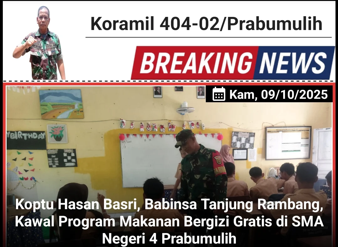 Kodam II/Sriwijaya, Prabumulih – Koptu Hasan Basri, Babinsa Kelurahan Tanjung Rambang yang merupakan anggota Koramil 404-02/Prabumulih Kodim 0404/Muara Enim, aktif memonitor kegiatan Makanan Bergizi Gratis (MBG) di SMA Negeri 4 Prabumulih, Kelurahan Tanjung Rambang, Kecamatan Rambang Kapak Tengah (RKT), Kota Prabumulih pada Kamis (09/10/2025).