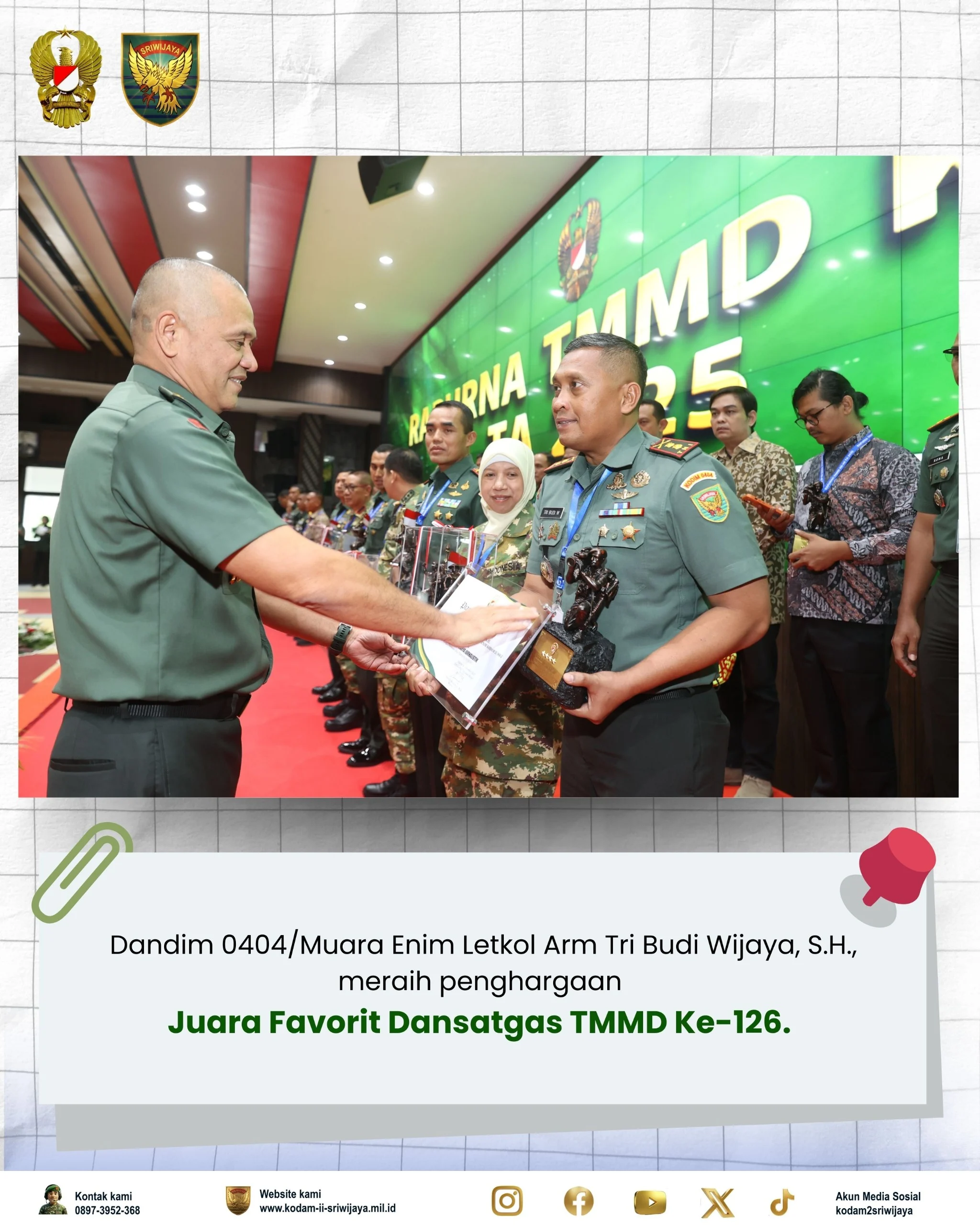 Sementara itu, Kodim 0404/Muara Enim turut menorehkan prestasi pada ajang Lomba Karya Jurnalistik TMMD Ke-126. Satuan tugas Kodim 0404/Muara Enim berhasil meraih Juara Favorit Dansatgas TMMD, yang diterima langsung oleh Dandim 0404/Muara Enim, Letkol Arm Tri Budi Wijaya, S.H. Penghargaan ini menjadi bukti bahwa pelaksanaan TMMD di wilayah Muara Enim berjalan dengan baik dan diapresiasi secara nasional.