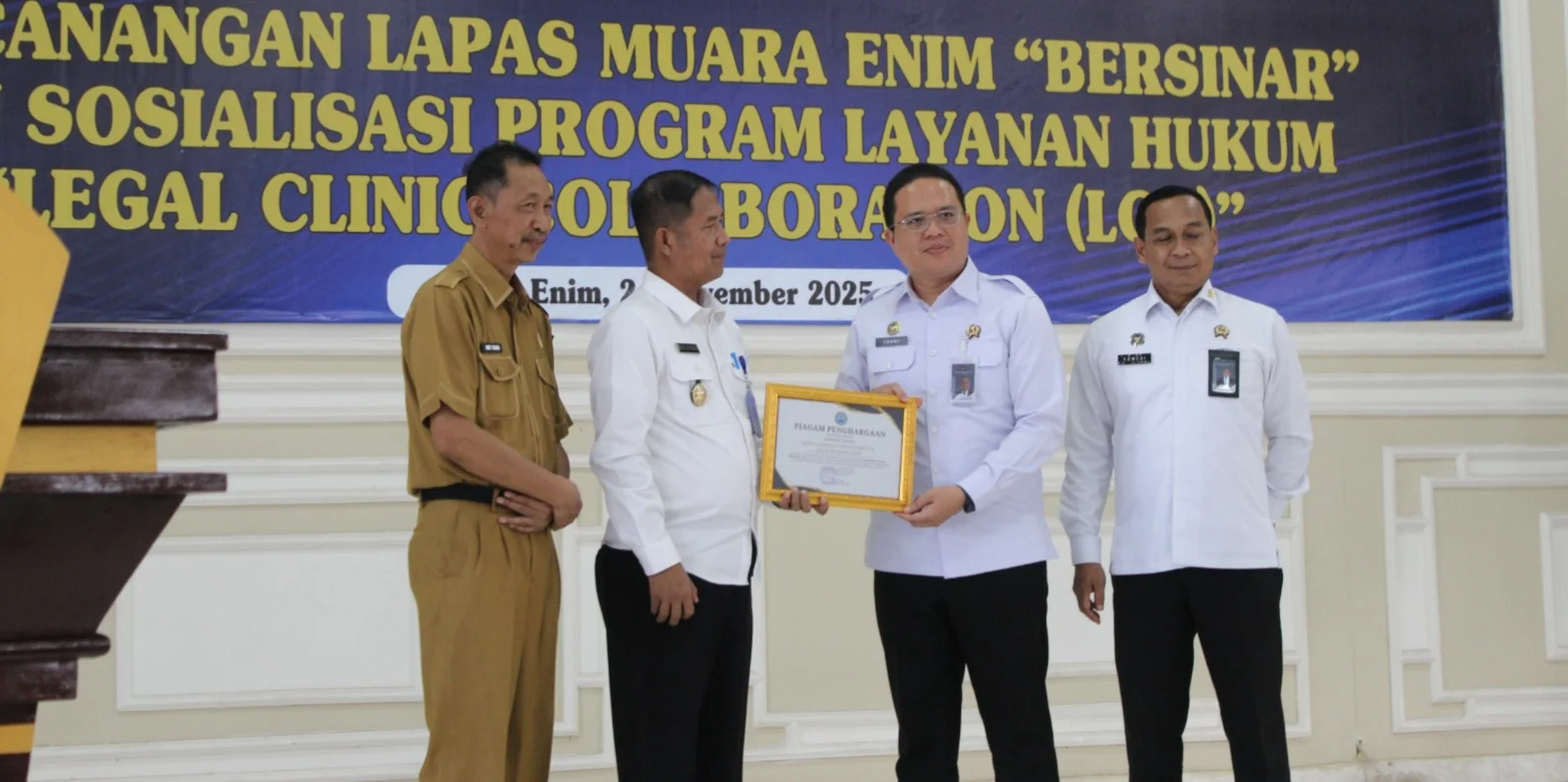Muara Enim , Kompasneesinvestigasi.id – Lembaga Pemasyarakatan (Lapas) Kelas IIB Muara Enim terus menunjukkan komitmennya dalam meningkatkan kualitas pelayanan dan memberantas narkoba. Pada hari Senin, 24 November 2025, Lapas Muara Enim menerima Sosialisasi Legal Clinic Collaboration (LCC) dari Kepala Kantor Wilayah (Kakanwil) Kementerian Hukum dan HAM Sumatera Selatan, serta menerima penghargaan sebagai LAPAS BERSINAR (Bersih Narkoba) dari Badan Narkotika Nasional Kabupaten (BNNK) Muara Enim.